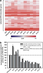 The addition of polyethyleneglycol (PEG) side chains to interferon α-2a improves the serum stability and clinical efficacy. Current commercial PEG-INF formulations such as PEGASYS® are heterogeneous and contain multiple monopegylated isomers. We have analyzed the activity of nine, purified monopegylated variants in antiproliferative, antiviral and binding assays, together with a global transcriptional analysis using DNA oligonucleotide microarrays. We show a direct correlation between biological and transcriptional activity for all isomers and an inversed correlation between IFN-receptor 2a affinity and signal transduction. Two out of nine positional isomers have a higher specific biological and transcriptional activity than the mixture, which can be explained by unique structural features of interferon signaling, which involves two distinct receptors. The possible clinical implications are discussed, which might guide the development of pegylated interferons with improved pharmacological properties.