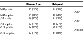 Table 2 Analysis of BAX, p53 and VEGF expressions in the 39 disease-free patients and the 40 relapsed patients
