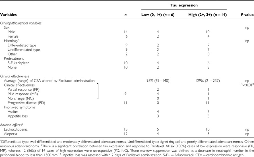 Table 1 Relationship between tau expression and the clinical usefulness of paclitaxel in 20 paclitaxel-administrated cases of gastric cancer