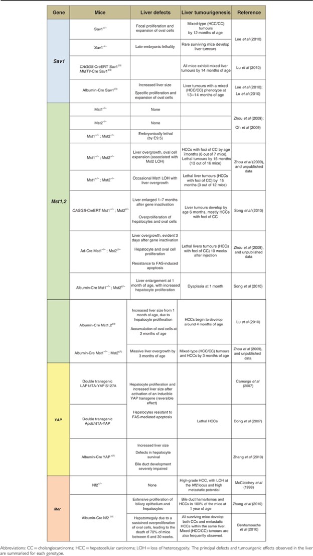 Table 1 Description of the different phenotypes resulting in the inactivation of the Sav1, Mst1/2, YAP and NF2/Mer genes in mouse
