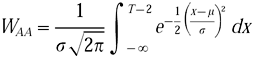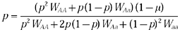 . The relative fitnesses of Aa and aa, (WAa, Waa, respectively) are calculated in the same manner, replacing T−2 with T−1 and T, respectively. At equilibrium we have (Crow & Kimura, 1970, p. 259, eqn 6.22):