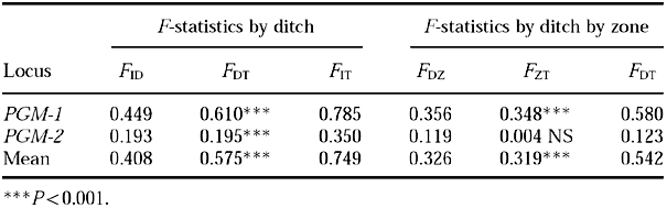 Table 2 F-statistics (Wright, 1978) calculated for each PGM locus of Potamogeton coloratus, combined across loci, by ditch (D) (columns 2–4); hierarchical F-statistics by ditch and by zone (Z) (columns 5–7)