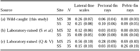 Table 1 (a) Mean bilateral asymmetry and standard error (in parentheses) for three traits in Gila topminnows for wild-caught specimens from Monkey Spring (MS) and Sharp Spring (SS), where N is the sample size. Below are given the extent of asymmetry for the same three traits for laboratory-raised fish (b) from Sheffer et al. (1997) (S et al.) and (c) from Quattro & Vrijenhoek (1989) (Q & V)