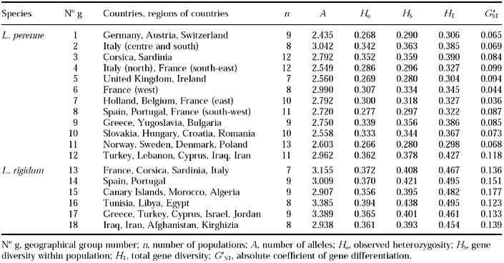 Table 3 Mean values of genetic diversity and differentiation parameters within geographical groups of Lolium perenne and L. rigidum