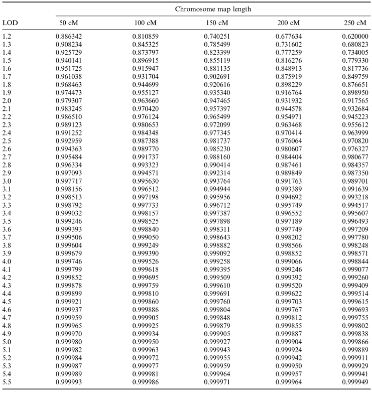 Table 1 Cumulative distribution function† of the maximum LOD on a chromosome for QTL analysis based on two QTL genotypes†