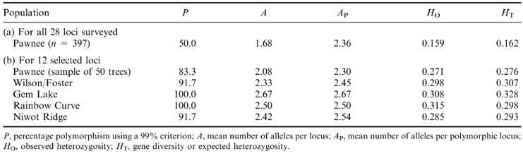 Table 1 Measures of genetic variation in limber pine. Results in (a) are based on a survey of 397 of the 455 trees in the Pawnee population. Results in (b) are based on random samples of 50 trees from each population, using data from only the 12 widely variable loci for which all trees were scored