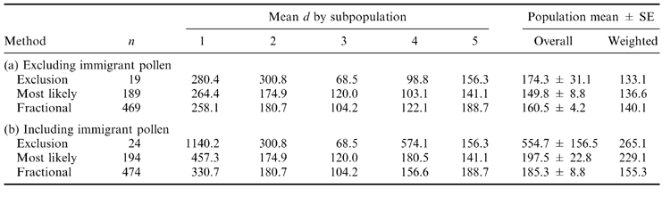 Table 6 Mean distance of gene dispersal via pollen (d ) for limber pine seeds at Pawnee estimated by three methods. Weights based on seeds examined/cones produced per subpopulation. (a) Results excluding immigrant pollen. (b) Including minimum dispersal distances for immigrant pollen (2000 m)
