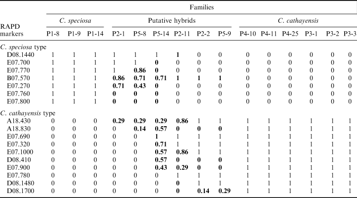 Table 4 Frequencies of diagnostic RAPD markers within families. Families are ordered from predominantly C. speciosa types to predominantly C. cathayensis types (with direction of hybridization hypothesized from cpDNA data). Apparently introgressed markers are printed in bold