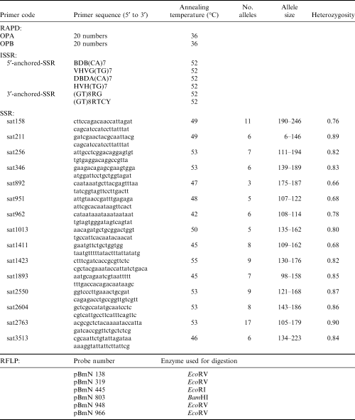Table 2 A list of RAPD, ISSR and SSR primers and multilocus RFLP probes used in the study