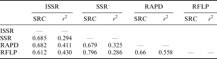 Table 5 Correlations obtained between the genetic similarities in silkworms calculated using ISSR, SSR, RAPD and RFLP techniques, based on comparison of similarity matrices (Spearman’s rank correlation [SRC] and regression analysis) r2