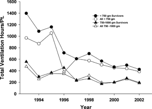 RESULTS: From 1992 through October 2002, 6254 infants were admitted, of whom 2388 required intubation for mechanical ventilation. Of these, 837 were <1500 g at birth (VLBW) infants and 453 were less than 1000 g (ELBW). Total duration of ventilation decreased in all weight groups. Noninvasive ventilatory support increased from 20 to 55% of total ventilation from 1997 to 2002. During this same period, CLD decreased from 20 to 11% in ventilated VLBW infants. Duration of total ventilation was best predicted by birth weight, with each 100 g increment decreasing the duration of ventilation by 71 hours. Lower birth weight, male sex, and a longer total duration of ventilatory support were significant factors in predicting the occurrence of CLD. Death alone was best predicted by lower birth weight and maximum oxygen index (OI). Transported infants had significantly increased maximal OIs, durations of ventilation, and incidence of death. A total of 48% of infants with a single OI >10 either died or survived with CLD.
