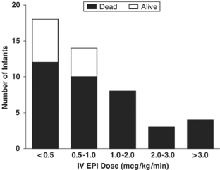 RESULTS: In all, 91 infants ≤750 g birth weight were identified, the overall survival rate was 35/91 (38%). A total of 15 infants received CPR, none of these infants survived to discharge. A total of 47 infants received continuous IV EPI of which 10/47 survived in comparison to 25/44 infants who did not receive this treatment (p<0.001). Increasing dosage of IV EPI was associated with decreased survival. All infants who received epinephrine at a dose >1.0 mcg/kg/hour intravenously died.