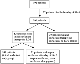 A retrospective analysis of a cohort of all patients admitted over a 3-year period with birth weights <1000?g (ELBW infants). Information was collected by chart review and the patients were categorized into three distinct groups for analysis. Initial surfactant only, patients who received surfactant replacement therapy only for respiratory distress syndrome (RDS); repeat surfactant, patients who received both initial surfactant replacement for RDS and repeat surfactant therapy for postsurfactant slump (defined as respiratory failure after 6 days of age), and no surfactant, patients in whom no surfactant was ever administered. A respiratory severity score (RSS) was used to measure the severity of lung disease and response to surfactant therapy.