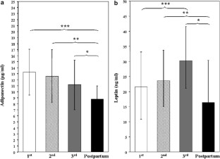 Adiponectin and leptin levels were tested in 80 pregnant women, 20 in each trimester (mean gestational age 10.5±1.9; 19.3±4.9; 39.3±0.8 weeks,) as well as 4 days postpartum.