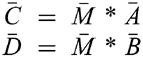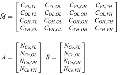 (D) Determine the observable number of controls, using the misclassification matrix \(\overline{M}\) and the true case and control distributions, \(\overline{A}\) and \(\overline{B}\), respectively. Let: