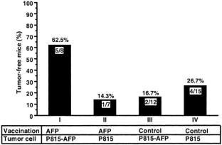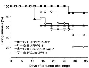 The oncofetal alpha-fetoprotein (AFP) is reexpressed in the majority of hepatocellular carcinomas and may be used as a target molecule for an immunotherapy or prophylaxis against this tumor. We investigated the potential of DNA vaccination with AFP-expressing plasmid DNA to induce an immune response against AFP-expressing tumor cells in DBA/2 mice. 62.5% of mice vaccinated with AFP-expressing plasmid DNA, rejected subcutaneous syngeneic AFP-expressing P815 tumors, whereas only 16.7% of mice vaccinated with control plasmid rejected these tumor cells (P=.03). Mean survival of mice after challenge with subcutaneous AFP-expressing tumor cells was prolonged for 8 days in mice vaccinated with AFP-expressing DNA (35 days) compared to mice vaccinated with control plasmid (27 days). To rule out possible autoimmune reactions against regenerating liver, which also reexpresses AFP, we evaluated the influence of AFP-specific DNA vaccination on liver regeneration in DBA/2 mice. Histologic quantification of proliferating hepatocytes and of the amount of necrotic liver tissue in carbon tetrachloride–damaged liver did not reveal statistically significant differences in mice vaccinated with AFP-expressing plasmid compared to control mice. These data suggest that AFP-specific DNA vaccination represents a useful tool to inhibit growth of AFP-expressing tumors in mice that does not affect liver regeneration.