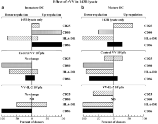 Dendritic cell (DC) therapies using DC presenting tumor antigen/s can induce CD8+ CTL that mediate tumor eradication, nonetheless many patients remain unresponsive. Thus, cytokine gene vectors applied to DC may amplify these responses. Herein, we examined the responses that monocyte-derived DC (at different maturational stages) make when infected with a vaccinia virus-interleukin-2 (VV-IL-2) vector in vitro. VV-IL-2-infected DC secreted significant levels of bioactive IL-2 and maintained their antigen presentation function. However, we show that DC are exquisitely sensitive to their local antigenic microenvironment, and that responses generated by one antigen can be altered by another. VV-IL-2 infection of immature DC led to DC activation (upregulation of CD80, CD86 and class II surface molecules) when the virus was propagated through xenogeneic, but not syngeneic, mammalian cells; these DC secreted IL-10 and tumor necrosis factor-α (TNF-α), but not IL-12. In contrast, after VV-IL-2 infection (regardless of their mammalian cellular context), IFNγ/LPS-matured DC inevitably downregulated their antigen presenting machinery. In conclusion, immunostimulatory DC can be generated by VV-IL-2, but this depends upon (i) infecting immature DC only, (ii) the mammalian cells through which the virus is prepared and (iii) individual donors; hence donors must be screened to assess their specific responses.