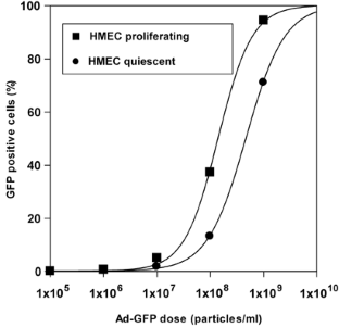 Cultured primary human cells have been widely used to assess the selectivity of oncolytic viruses as potential anticancer agents. As culture conditions can potentially have a significant impact on virus replication and ultimately cell killing, we evaluated the effects of dl309, a wild-type adenovirus, and dl01 / 07, a conditionally replicating adenovirus mutant, on quiescent and proliferating primary mammary epithelial cells. When primary cells were induced into quiescence, both viruses exhibited similar attenuated cell killing. However, cell killing by dl309 was superior to dl01 / 07 in proliferating primary cells. Analysis of viral effects at the level of entry, E2F activation, DNA replication, and late gene expression indicated that attenuation of dl309 in quiescent cells correlated with decreased expression of viral late genes such as hexon. In contrast, attenuation of dl01 / 07 in quiescent cells correlated with inefficient induction of E2F activity and inability to undergo efficient DNA replication. In proliferating cells, dl309 replicated efficiently, whereas dl01 / 07 still showed attenuated replication. In summary, our results indicate the intrinsic preference of wild-type adenoviruses for killing proliferating cells, which is an attractive feature for using adenoviruses as oncolytic agents. These results also highlight the need for the use of appropriate growth conditions for primary cells in vitro to distinguish subtle differences in cell killing among various oncolytic viruses.