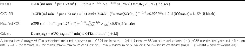 Table 1 Equations used for calculation of eGFR and carboplatin dosing