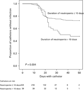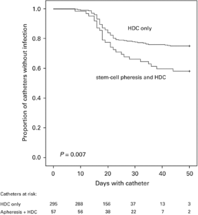 Neutropenia following high-dose chemotherapy leads to a high incidence of infectious complications, of which central venous catheter-related infections predominate. Catheter-related infections and associated risk factors in 392 patients participating in a randomized adjuvant breast cancer trial and assigned to receive high-dose chemotherapy and peripheral stem-cell reinfusion were evaluated. Median catheter dwell time was 25 days (range 1–141). Catheter-related infections were seen in 28.3% of patients (11 infections per 1000 catheter-days). Coagulase-negative staphylococci were found in 104 of 186 positive blood cultures (56%). No systemic fungal infections occurred. Cox regression analysis showed that duration of neutropenia >10 days (P=0.04), using the catheter for both stem-cell apheresis and high-dose chemotherapy (P=<0.01), and use of total parenteral nutrition (TPN, P=0.04) were predictive for catheter-related infections. In conclusion, a high incidence of catheter-related infections after high-dose chemotherapy was seen related to duration of neutropenia, use of the catheter for both stem-cell apheresis and high-dose chemotherapy, and use of TPN. Selective use and choice of catheters could lead to a substantial reduction of catheter-related infectious complications.