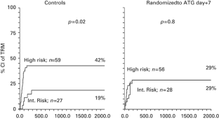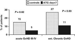 We have previously shown that hemopoietic stem cell transplant (HSCT) recipients can be stratified on day+7 as having low, intermediate or a high risk of transplant-related mortality (TRM). With the aim of reducing TRM and GVHD, intermediate and high-risk patients (n=170) were randomized to receive anti-thymocyte globulin (ATG, thymoglobuline) on day+7 (n=84) or no treatment (n=86) (controls). There was a reduction of TRM from 35% in controls to 29% in ATG patients (P=0.3), of acute GVHD III–IV from 15 to 5% (P=0.02) and of chronic GVHD from 26 to 11% (P=0.03); survival was comparable. The predictive value of the day+7 score on TRM was confirmed for controls (19 vs 42% for intermediate vs high risk, respectively, P=0.03), whereas ATG abrogated this predictive effect (29 vs 29%). ATG reduced GVHD (P=0.006) in high-risk patients, but not in patients with an intermediate risk. In conclusion, we confirm that TRM can be predicted on the basis of day+7 laboratory values, after alternative donor HSCT; in high-, but not intermediate-risk patients, the administration of ATG on day+7 reduces GVHD. These results may represent a platform for risk-adapted post transplant immune modulation.