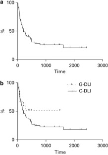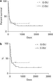 There is little data comparing the activity and toxicity of donor lymphocyte therapy with granulocyte (G)-CSF-mobilized cells (G-donor lymphocyte infusion (DLI)) with the conventionally collected DLI (C-DLI) after allogeneic blood or marrow transplantation. We retrospectively evaluated 67 patients to compare the efficacy and toxicity of GCSF-mobilized DLI with C-DLI in the treatment of relapse of malignant disease or poor donor engraftment post transplant. We assessed clinical outcomes that may represent the immunological outcome of DLI. The median OS was 210 days (range 3–2436 days), 291 days (range 17–1491 days) in the G-DLI group (15 patients) and 207.5 days (range 3–2436 days) in the C-DLI group (52 patients). The median PFS time was 72 days (range 8–1491 days) in the G-DLI group vs 82 days (range 1–2436 days) in the C-DLI group. Rates of post DLI GVHD and improvement in donor engraftment were similar in the G-DLI and C-DLI groups. We conclude that G-DLI appears to have similar therapeutic activity to that seen with C-DLI, and where such cells are available they may be substituted for conventional donor lymphocytes.