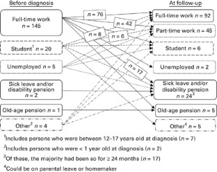 Being in work or the equivalent is an important goal after allo-SCT and is used as an indicator of recovery. The aim was to elucidate occupational status and factors associated with work among SCT survivors. Adults in working age with a haematological disease (n=177) were followed up within a median of 8 (range 28) years post allo-SCT. Predictors of not being in work at all or working part-time because of sick leave, disability pension or early old-age pension were analyzed using logistic regression analyses. At diagnosis, 82% of the participants were working full-time and 2% were on sick leave or old-age pension. At follow-up, 52% were working full-time, 27% were working part-time and 17% were on sick leave, disability pension or old-age pension. Not working at all was associated with multi-morbidity (P=0.01) and poorer health (P=0.00). Working part-time was associated with a higher age at diagnosis (P=0.00), being a woman (P=0.03), being born abroad (P=0.03) and multi-morbidity (P=0.00). In conclusion, the majority of survivors were in paid work at follow-up; however, a substantial number were not working or worked part-time.