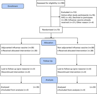 Halasa NB, Savani BN, Asokan I, Kassim A, Simons R, Summers C et al. Randomized double-blind study of the safety and immunogenicity of standard-dose trivalent inactivated influenza vaccine versus high-dose trivalent inactivated influenza vaccine in adult hematopoietic stem cell transplantation patients. Biol Blood Marrow Transplant 2016; 22: 528–535.