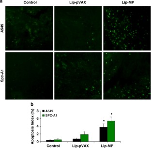 Vesicular stomatitis virus (VSV) matrix protein (MP) can induce in vitro apoptosis of tumor cells in the absence of other viral components. Here, the antitumor activity of VSV-MP against lung adenocarcinoma was investigated in vivo. A pVAX-plasmid DNA encoding VSV-MP and control empty vectors (pVAX) were constructed and wrapped-up with liposome. A549 and Spc-A1 human lung adenocarcinoma cells were transfected with liposomal-VSV-MP (Lip-MP) or Lip-pVAX and then examined for cell viability or apoptosis using Hoechst/propidium iodide staining by flow cytometry, and further demonstrated by caspase/poly ADP-ribose polymerase (PARP) cleavage analysis. For the in vivo study, A549 and Spc-A1 lung carcinoma models in nude mice were established and randomly assigned into three groups to receive eight 2-weekly intravenous administrations of medium alone as control, Lip-pVAX or Lip-MP, respectively. Subsequently, Lip-MP significantly reduced tumor growth and prolonged the survival of tumor-bearing mice compared with Lip-pVAX and control agents (P<0.05), with much higher apoptosis index of both in vivo and in vitro tumor cells, respectively (P<0.05). In addition, in vivo antitumoral effect was associated with natural killer-(NK) cell congregation without evidence of toxicity. These observations suggest that systemically delivering Lip-MP has a specific dual antitumor activity in human lung adenocarcinoma by inducing apoptosis and possibly stimulating NK-cell responses, it may provide a clue for developing new therapeutic approaches against human lung adenocarcinoma.