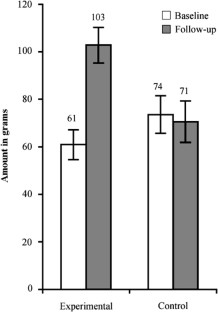 Participants were 4- to 11-year-old children attending two primary schools; the schools were randomly assigned to experimental or control conditions (n=228 and 207, respectively). During the 16-day intervention in the experimental school, children watched video adventures featuring the heroic Food Dudes, and received small rewards for eating fruit and vegetables provided. In both schools, parental provision and children's consumption of fruit and vegetables in the lunchboxes were assessed at baseline and 12-month follow-up (Lunchbox measures). Fruit and vegetables were provided in both schools over an 8-day baseline phase and the 16-day intervention, and children's consumption was measured (school-provided food measures).