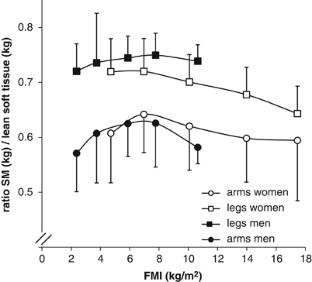 The relationship between lean and FM was influenced by adiposity, age and gender. With increasing adiposity, SM/AT declined faster at the trunk in men and at the extremities in women. The contribution of appendicular SM to lean soft tissue of arms and legs tended to decrease at a higher adiposity in both genders (FMI >6.97 kg/m2 in women; FMI>7.77 kg/m2 in men).