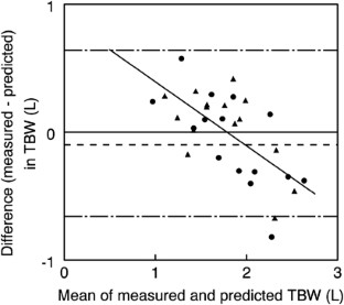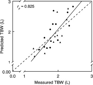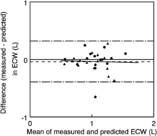 Data were available for 91 preterm infants. BIS-predicted TBW and ECW correlated well with the measured volumes (Pearson’s rp=0.825 and 0.75, respectively). There was a small bias (TBW 10 ml and ECW 40 ml) but large limits of agreement (TBW±650 ml and ECW ±360 ml).
