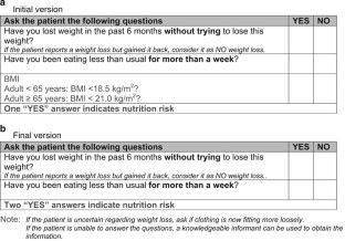 Laporte M, Villalon L, Payette H . Simple nutrition screening tools for healthcare facilities: development and validity assessment. Can J Diet Pract Res 2001; 62: 26–34.
