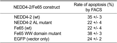 Table 1 Cell viability of Fe65 WW domain mutant, Nedd4-2 AL mutant, or its wild type. EGFP Nedd4-2 (wt) or its EGFP Nedd4-2 AL mutant or EGFP vector were transfected HEK 293 cells and the rate of apoptosis measured by FACS. EGFP Nedd4-2 mutant (not merged with Fe65) or EGFP Fe65 WW domain mutant significantly promoted cell survival, compared to Nedd4-2 (wt) or Fe65 (wt) constructs. For details, see Methods. Mean value of 5 repeats