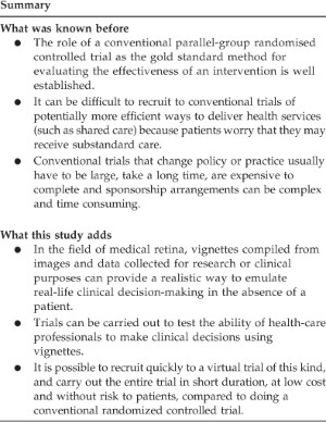 The ECHoES trial design has several advantages over a conventional randomised trial in which recruitment of patient participants would have had considerable resource implications, been costly, time consuming and potentially unacceptable to patients with nAMD. The data collection element was small; it consisted mainly of participants’ responses to questions about image features, lesion status classifications, referral decisions, resource use and costs. It used very little paper because data were entered directly into the web application and most of the trial related administration was also carried out electronically. Very few face-to-face meetings were required to develop the vignettes and the reference standard was created mainly by the experts using the web application. Trial administration and participant correspondence/progression through the trial was managed electronically so there are negligible archiving costs.