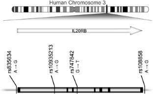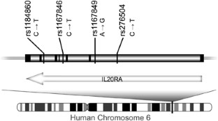 The interleukin-20-receptor I complex (IL-20-RI) is composed of two chains, IL20RA and IL20RB. Its ligands are the three members of the IL19 subfamily of cytokines, IL-19, IL-20 and IL-24. These cytokines are important in the manifestation of psoriatic lesions and, recently, an association of polymorphisms of IL20 with psoriasis has been described. In the present study we tested the hypotheses that genetic variations of the IL-20-RI influence susceptibility to psoriasis and investigated single nucleotide polymorphisms (SNPs) in the IL20RA and IL20RB genes in psoriasis patients (n=254) and healthy controls (n=224). We found no association of any of the investigated SNPs with the disease. Analysis of pairwise linkage disequilibrium (LD) across studied markers revealed a strong level of LD between SNPs within the IL20RA gene and SNPs within the IL20RB gene, and, for both genes six common haplotypes were identified with an estimated frequency ⩾1%. Haplotype analyses suggested that the IL20RA haplotype CCG (rs1184860, rs1167846, rs1167849) is significantly associated with psoriasis (OR 3.14, 95% CI 1.61–6.14), whereas the TTG haplotype had a protective effect (OR 0.20, 95% CI 0.07–0.55). The risk haplotype defining SNPs 1167846 and 1184860 were found to modify paired box 5 and homeobox A9 sites, respectively, two transcription factors related to the differentiation of immune cells. Further studies are needed to confirm the genetic association and to investigate the functional relevance of IL20RA haplotypes in psoriasis.
