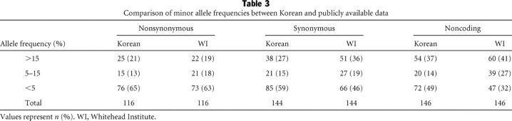 Table 3 Comparison of minor allele frequencies between Korean and publicly available data