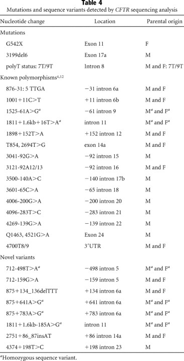 Table 4 Mutations and sequence variants detected by CFTR sequencing analysis