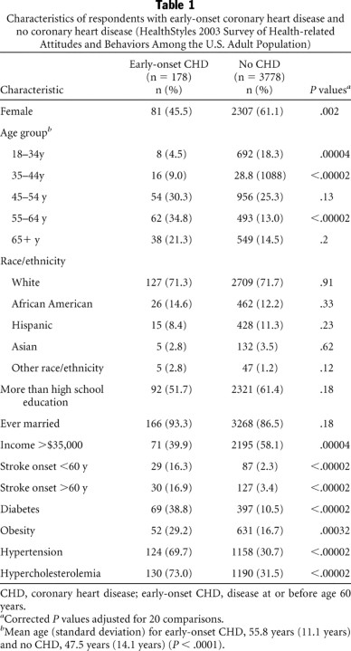 Table 1 Characteristics of respondents with early-onset coronary heart disease and no coronary heart disease (HealthStyles 2003 Survey of Health-related Attitudes and Behaviors Among the U.S. Adult Population)