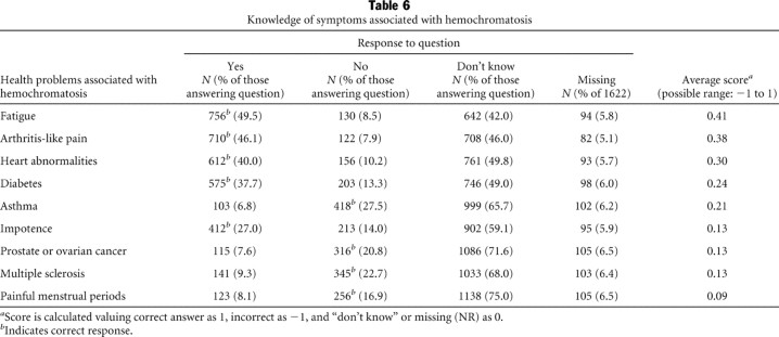 Table 6 Knowledge of symptoms associated with hemochromatosis