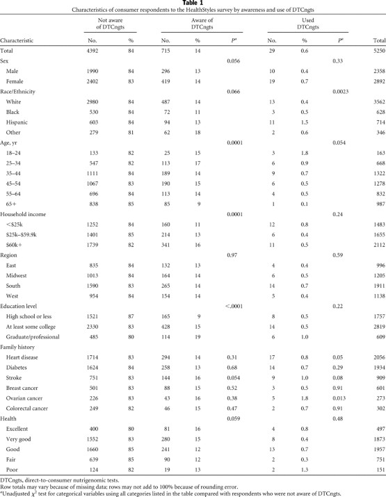 Table 1 Characteristics of consumer respondents to the HealthStyles survey by awareness and use of DTCngts