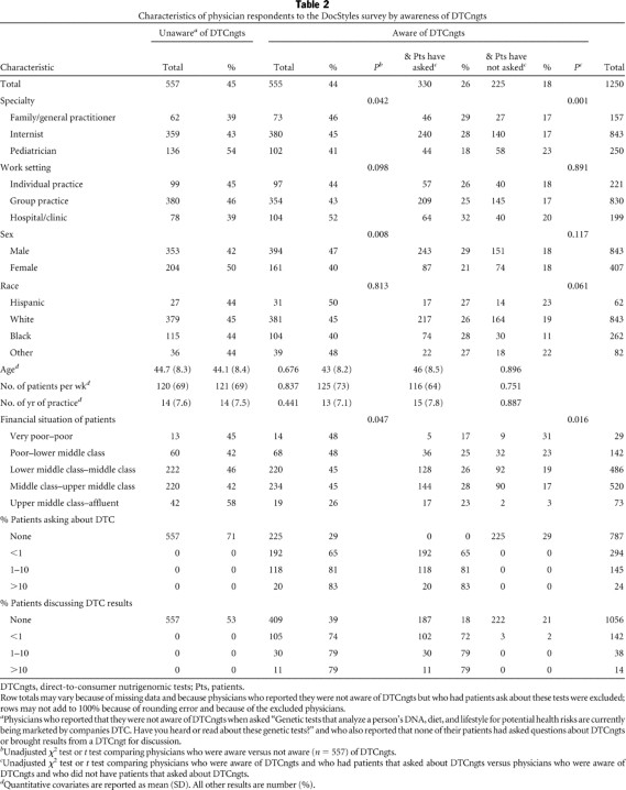 Table 2 Characteristics of physician respondents to the DocStyles survey by awareness of DTCngts