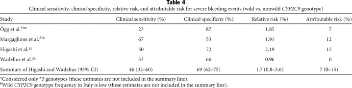 Table 4 Clinical sensitivity, clinical specificity, relative risk, and attributable risk for severe bleeding events (wild vs. nonwild CYP2C9 genotype)