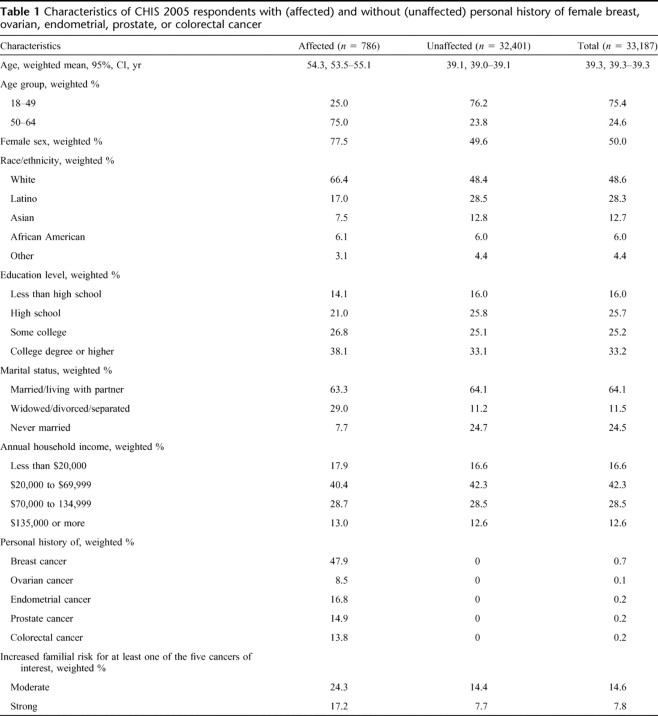 Table 1 Characteristics of CHIS 2005 respondents with (affected) and without (unaffected) personal history of female breast, ovarian, endometrial, prostate, or colorectal cancer