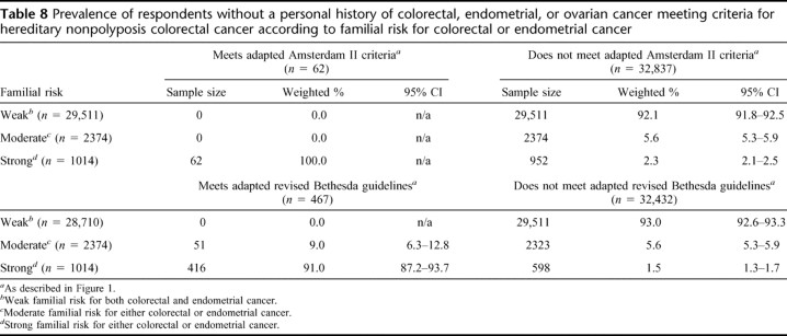 Table 8 Prevalence of respondents without a personal history of colorectal, endometrial, or ovarian cancer meeting criteria for hereditary nonpolyposis colorectal cancer according to familial risk for colorectal or endometrial cancer
