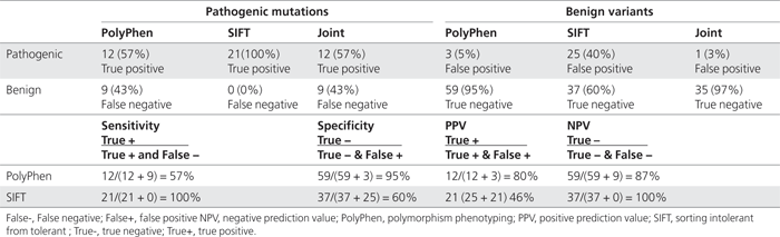 Table 1 Sensitivity and specificity for PolyPhen and SIFT when used to predict mtDNA confirmed mutations and known benign variants
