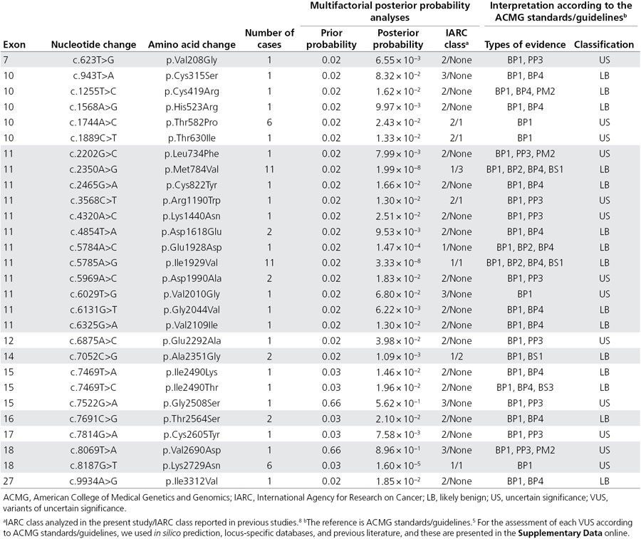 Table 2 BRCA2 VUS analyses using multifactorial posterior probability analyses and interpretation according to the ACMG standards and guidelines