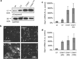 RNA interference allows selective gene silencing, and is widely used for functional analysis of individual genes in vertebrate cells and represents an attractive therapeutic option for treating central nervous system diseases. However, growing evidence exists that the expression of short hairpin RNAs (shRNAs) can trigger cellular immune response resulting in unspecific cellular phenotypes and severe side effects. We found that lentiviral vector (LV)-mediated expression of shRNAs in primary cortical cultures resulted in strong expression of the interferon-stimulated gene oligoadenylate synthetase 1 (Oas1), which was accompanied by accelerated apoptosis and substantial net neuron loss. Modification of the shRNA construct by implementing features of the naturally occurring microRNA-30 (miR-30) precursor avoided Oas1 induction in transduced primary cultures, whereby modification of the passenger strand seems to be a crucial feature to circumvent interferon-stimulated gene expression. This work represents the first experimental study showing that an miR-30-based shRNA construct prevents Oas1 pathway associated off-target effects, which we consider as an essential prerequisite for shRNA use in future gene therapeutic approaches.