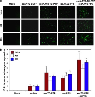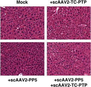 Recombinant vectors based on adeno-associated virus type 2 (AAV) target the liver efficiently, but the transgene expression is limited to ∼5% of murine hepatocytes. Viral second-strand DNA synthesis continues to be a rate-limiting step for efficient transduction by the single-stranded AAV (ssAAV) vectors. This is due, in part, to the presence of a cellular chaperone (FK506-binding) protein, FKBP52, phosphorylated forms of which interact with the D-sequence in the inverted terminal repeats of AAV2 genome and inhibit the viral second-strand DNA synthesis. Our previous studies have documented that dephosphorylation of FKBP52 at tyrosine residues by the cellular T-cell protein tyrosine phosphatase (TC-PTP), and at serine/threonine residues by protein phosphatase 5 (PP5) enhances viral second-strand DNA synthesis and consequently, the transgene expression. We have also reported that coinfection with a self-complementary AAV (scAAV)-TC-PTP vector results in up to sixfold increase in the transduction efficiency of conventional ssAAV2 vectors in primary murine hepatocytes in vivo. We reasoned that coinfection with scAAV-TC-PTP and scAAV-PP5 vectors may lead to a further increase in the transduction efficiency of ssAAV2 vectors. We demonstrate here that this strategy does indeed lead to ∼16-fold increase in the transduction efficiency of conventional ssAAV vectors in primary murine hepatocytes in vivo following tail-vein injections. Neither scAAV2-TC-PTP nor scAAV2-PP5 vectors alone or together had any adverse effect on the hepatocytes. Thus, this coinfection strategy may be useful for achieving expression from recombinant ssAAV2 vectors containing larger genes, such as coagulation factor VIII, which exceed the packaging capacity of scAAV vectors, for the potential gene therapy of hemophilia A.