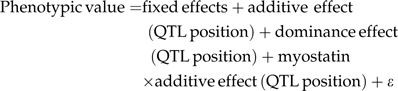 To test the potential interaction between a QTL and myostatin genotype, we first applied a forward QTL selection strategy. In this step, the dataset was split into two subsets by myostatin genotype. Interval mapping analysis was completed using the main effect QTL model without myostatin genotype effect within each subset. All positions that reached a 5% genome-wide significance level were identified. In the second step, the interaction between each of these positions and myostatin genotype was tested by comparing four models in the full data. Fixed effects in the following models were the same as before.